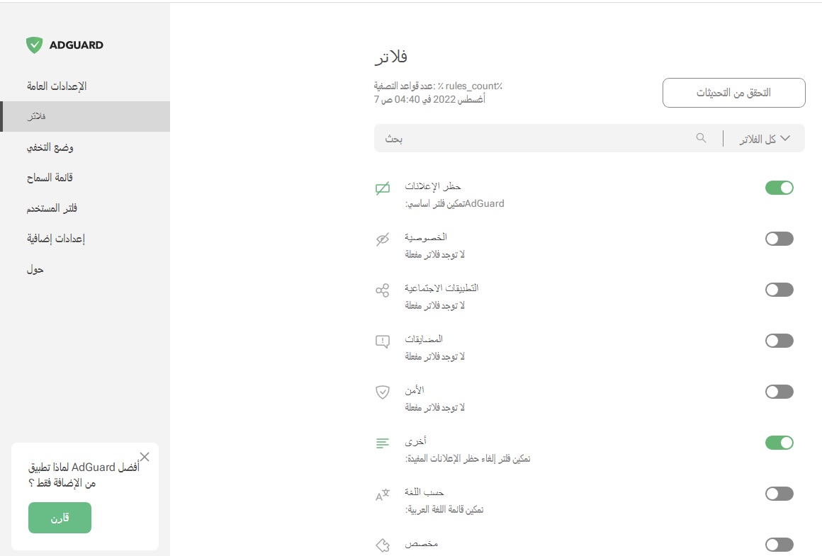 This relates to Arabic translation. AdGuard team can you please check that string for all languages? Filter rules count. It appears as code because there's a space in the variable.