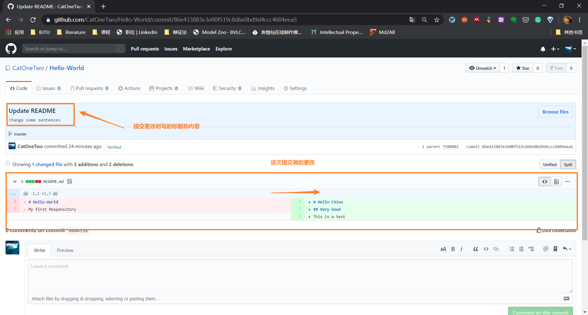 在页面底部,输入一条简短、有意义的提交消息,描述你对文件所作的更改。如果不写这条消息,以后回顾的时候不好追踪。写好之后点击提交。
