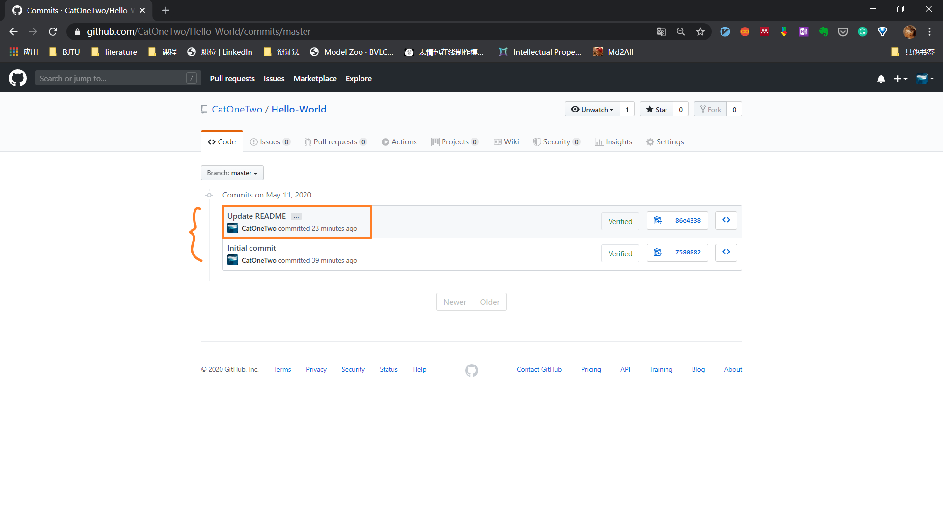 首先 Commits 数反映了提交更改的次数,点击它,我们就能看到提交历史。