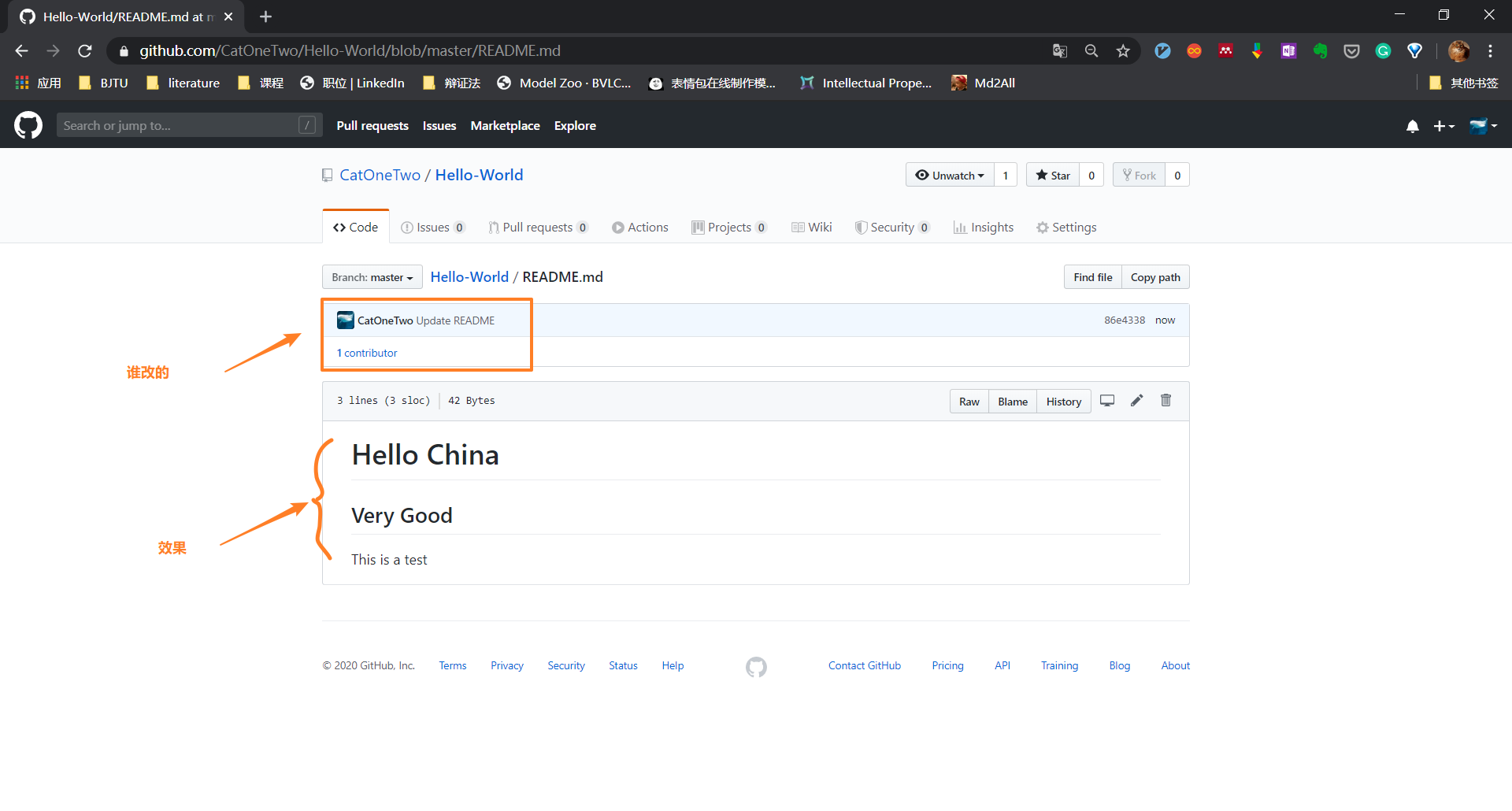 提交后,页面刷新,显示README更改后的效果,可以看到 README 的标题不一定和仓库名一样,它是可以修改的。