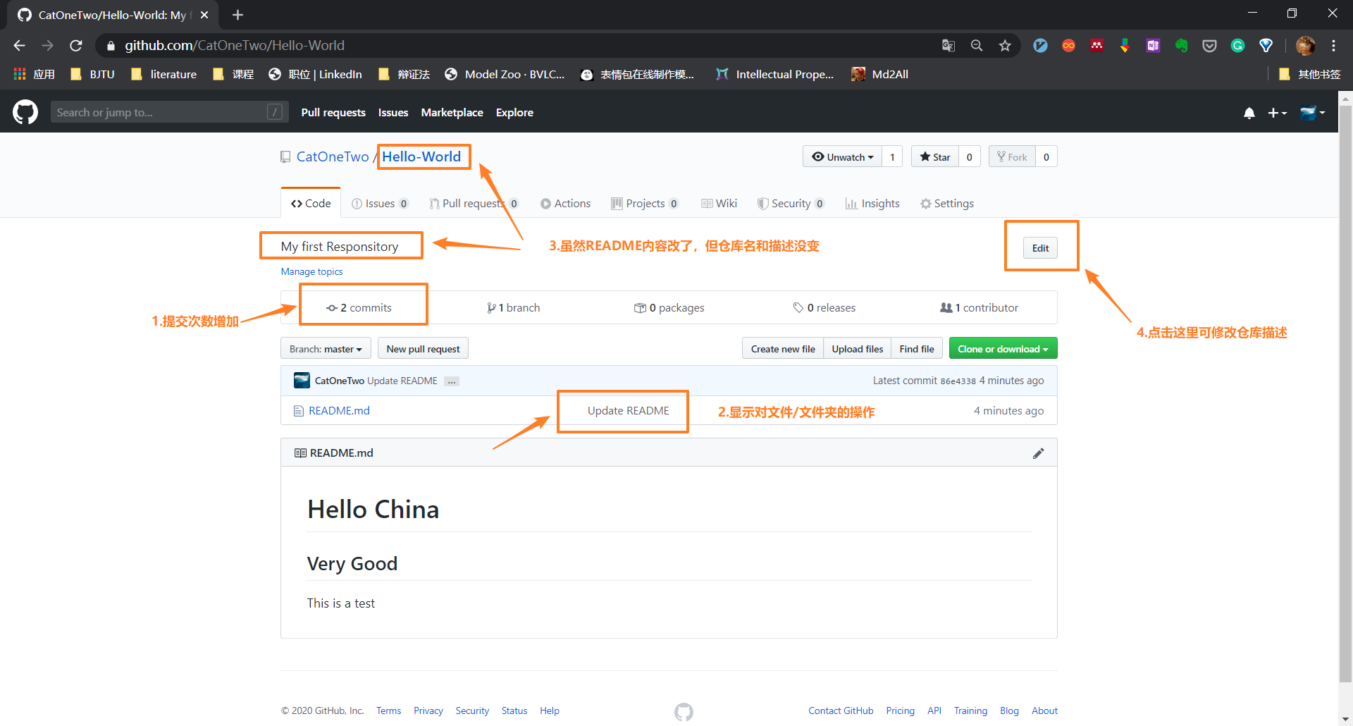 点击仓库名 Hello-World 回到仓库主页面,可以看到提交 commit 的次数增加变为 2,README.md 文件页显示了刚刚的操作。