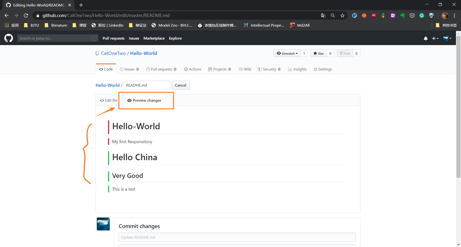 点击 Preview changes 预览更改,我们可以看到新内容以绿色显示