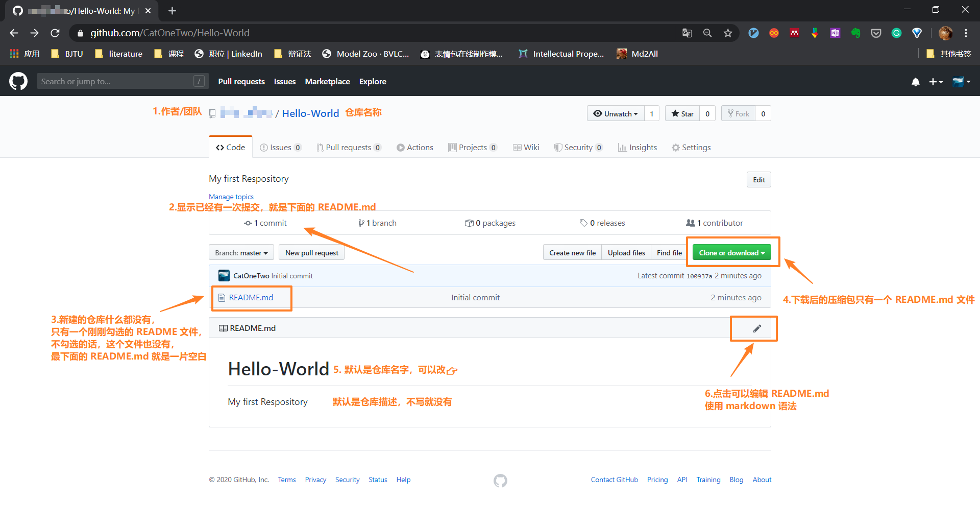 仓库名为 Hello World,包含 1 个commit,也就是我们通过勾选 Initialize this repository with a README,创建了一个初始化提交文件 README.md,其中文件后缀为 .md,表示文件为 Markdown 格式;包含 1 个branch,为master分支,即主分支;包含 1 个contributor,为贡献者,也就是我们自己。