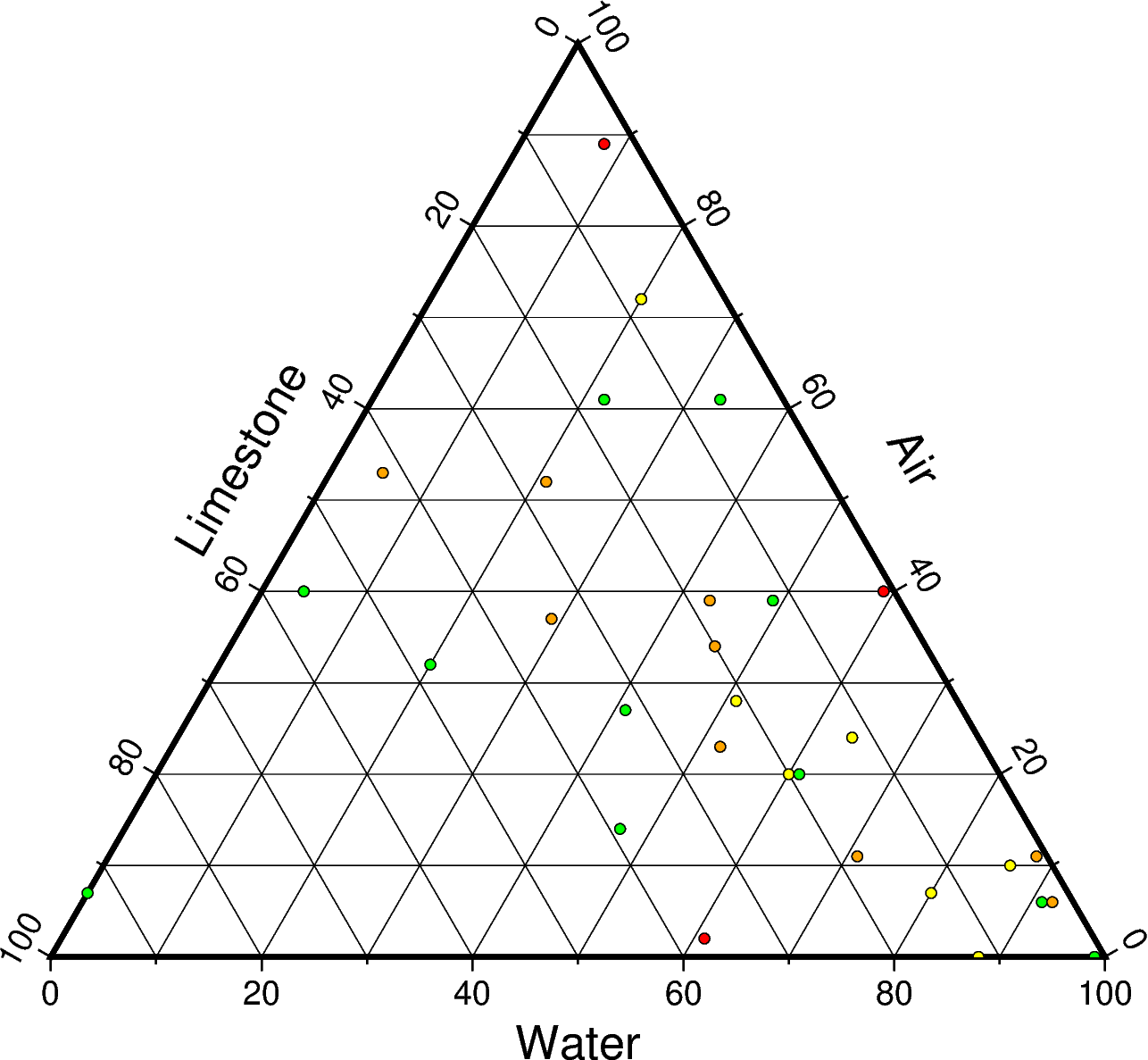 ternary, and there are still gridlines for that axis appearing in the final figure.fig = pygmt.Figure() pygmt.makecpt(cmap="turbo", series=[0, 80, 10]) fig.ternary(table="@ternary.txt", region="0/100/0/100/0/100", cmap=True, projection="X6i", frame= ["bafg+lAir", "cafg+lLimestone", "aafg+lWater"], S="c0.1c") fig.show()