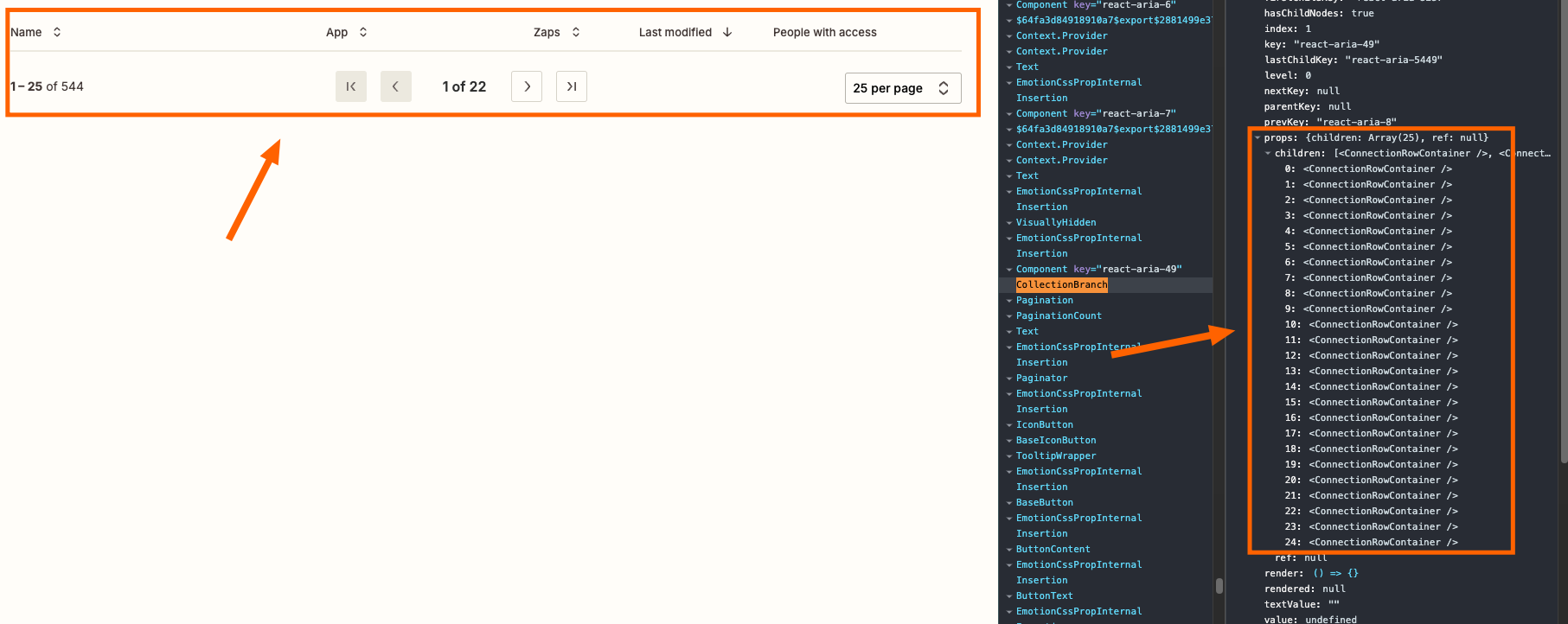 The collection key map appears to double in size, even though the table changes to display nothing because collection.size claims to be 0. The renderProps also declares that the Table is data-empty which supports that. I checked the constructor for BaseCollection, it gets called an alarming number of times, I'm not sure what's going on there, could be a red herring, it should only be invoked once in a lazy useState instantiation.