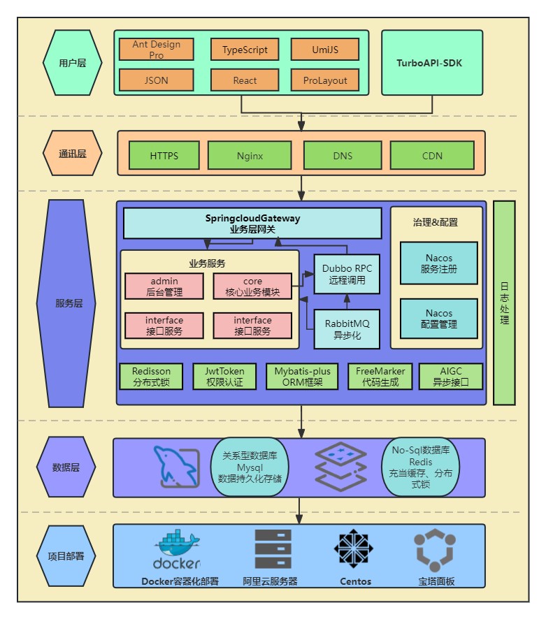 本项目为前后端分离项目,前端主要采用TypeScript、React、Antd Pro等主流开发框架。后端采用Spring Cloud SpringBoot 作为业务框架。通过Springcloud Gateway作为全局网关实现流量控制、负载均衡以及路由管理,使用Mybatis-plus作为持久层技术。使用Apache Dubbo做高性能远程服务调用。同时Nacos作为注册中心,完成服务注册与发现,通过各模块主要功能以及业务进行模块的合理划分。通过全链路日志以及回调配置, 支持异步接口调用 , 同时通过FreeMarker模板引擎进行自动化SDK代码以及接口文档生成 , 并通过Github Action完成SDK发版与接口文档部署。