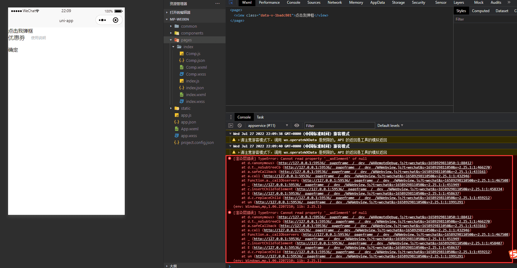 **问题描述** **复现步骤** 1. git clone [https://github.com/yxw007/uniapp_issue/tree/ComponentConsoleError](https://github.com/yxw007/uniapp_issue/tree/ComponentConsoleError) 2. cd ComponentConsoleError 3. npm install 4. npm run dev:mp-weixin 5. 等待编译完后,用微信开发者工具打开编译后工程 6. 点击:点击我弹框,看控制台输出报错  **预期结果** 不要报错 **实际结果** 报错 **系统信息:** - 微信小程序 - uniapp...