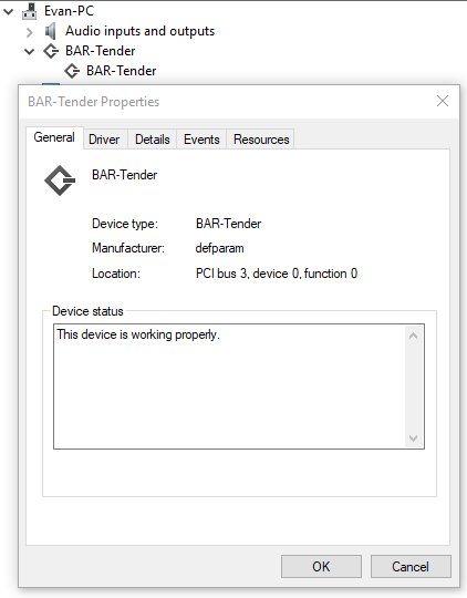 Welcome everyone! BAR-Tender is a physical FPGA I/O Device which services physical memory reads/writes via UMDF2 driver. This project is a succesor to pciworm and is enhanced with much more features.