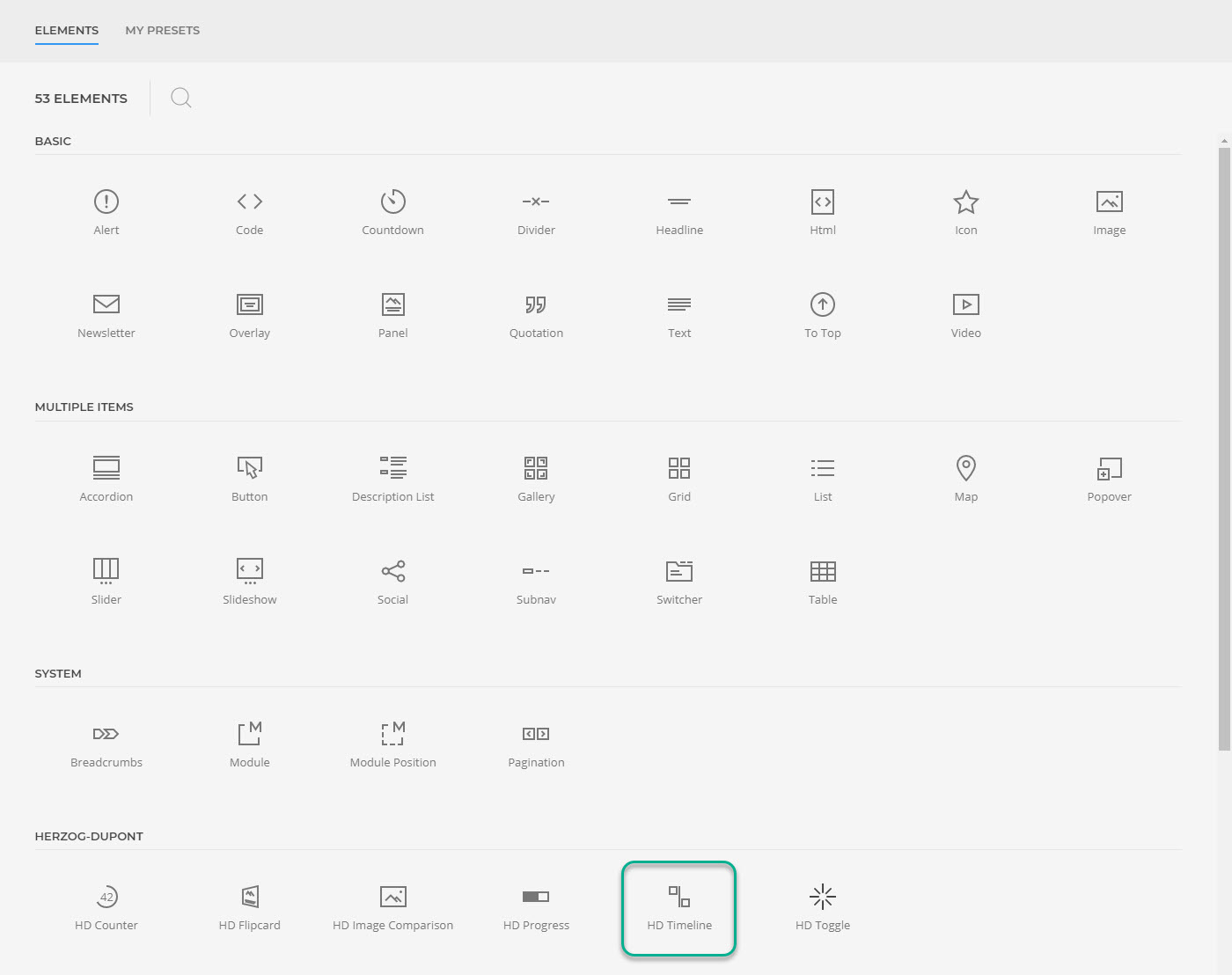 hd-timelineandhd-timeline_iteminto the directory/templates/yootheme_child/builder/(Joomla!) or/wp-content/themes/yootheme-child/builder/(WordPress) of your installation while child must be the name of your child theme - access the YOOtheme Pro Page Builder, the custom elements should now be available