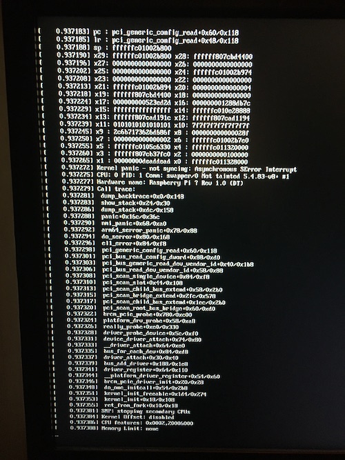 So far, I can report that the Network card is fully functional and works totally fine with the original driver and the 64-bit raspberry OS: “2020-05-27-raspios-buster-arm64.img”. A previous test with a 32-bit system resulted in an unfunctional card, because the network card only supports 64-bit. After I tested the card without any driver and kernel modifications, I set up my crosscompile environment and tried to recreate the kernel of my working Pi system. The goal was to evaluate the proper compiling of a custom kernel before applying any major driver changes. Building a fully functional system is still unsuccessful. In all my tries the kernel could be mounted without any issue. Booting without the wifi-card was successful. Only booting a custom kernel with the card inserted yielded a kernel panic during the boot process. The system logs can be seen in the picture below.