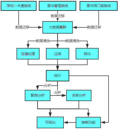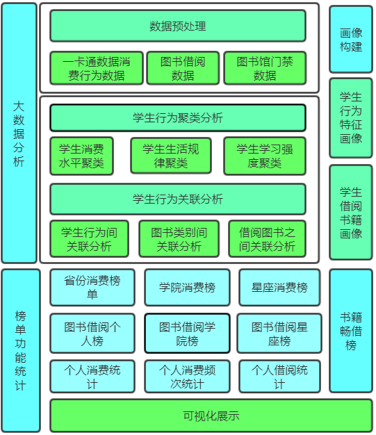 图中是对系统的结构设计,主要包括以下几个部分:(1)对分析数据的预处理;(2)对学生的行为聚类分析;(3)对学生的行为关联分析;(4)学生画像构建部分;(5)消费和借阅榜单统计部分;(6)可视化展示部分。