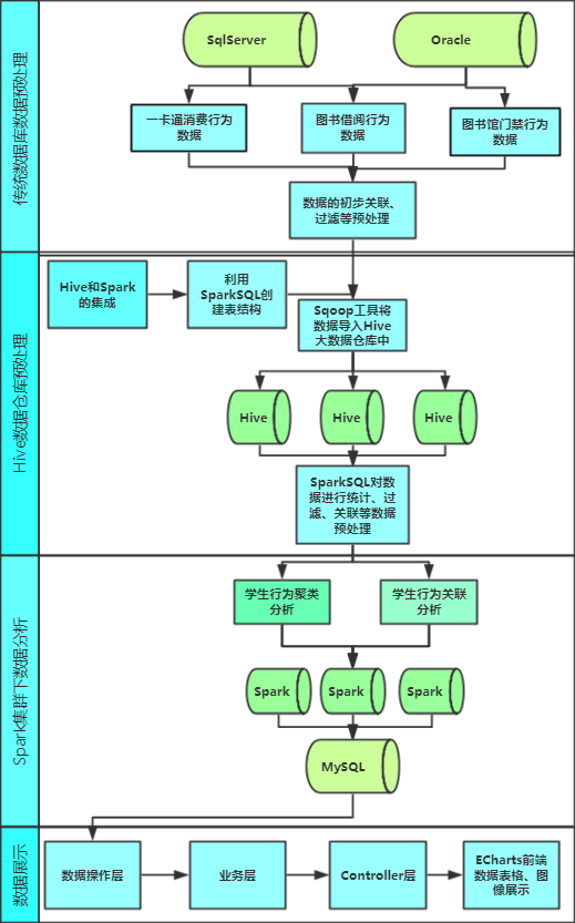 本系统主要流程是将学生的分析数据利用Sqoop工具从传统数据仓库中移到大数据的Hive数据仓库中,利用SparkSQL集成HiveSQL对数据进行预处理和统计、对处理好的数据进行学生行为聚类分析、学生行为关联分析、构建学生画像、统计分析实现榜单功能、最后对结果利用Echarts进行可视化展示,主要系统流程如图所示: