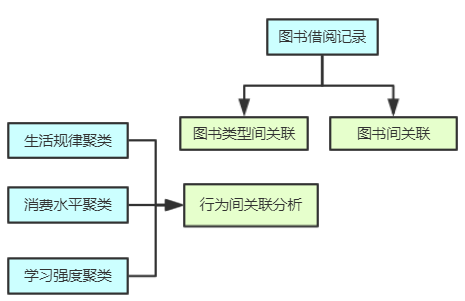 学生行为关联分析是对学生行为聚类后的生活规律聚类、消费水平聚类、学习强度聚类进行关联分析,得出不同学生行为之间存在的相关项;利用图书借阅记录中的借阅图书和借阅图书类型数据进行关联分析,得出不同借阅图书和不同借阅图书类型之间存在的相关性,关联分析。分析流程如下图所示。对学生图书借阅记录中的图书类别进行关联分析,可以得出学校图书馆中哪些类别经常被学生借阅,图书馆管理者可以有针对地对管藏进行优化布局。