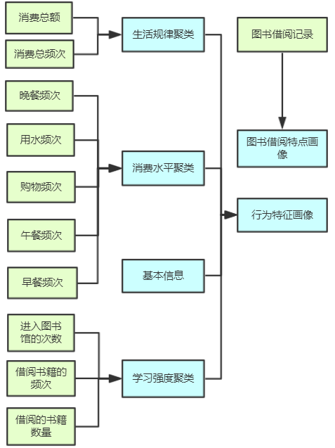 4)学生画像构建主要包括构建学生的行为特征画像和学生图书借阅特点画像。学生行为特征画像是依据学生的基本信息、学生的消费水平特征、学生生活规律行为特征、学生学习和借阅行为特征进行构建;学生图书借阅特点画像是依据学生已借阅数据进行构建。