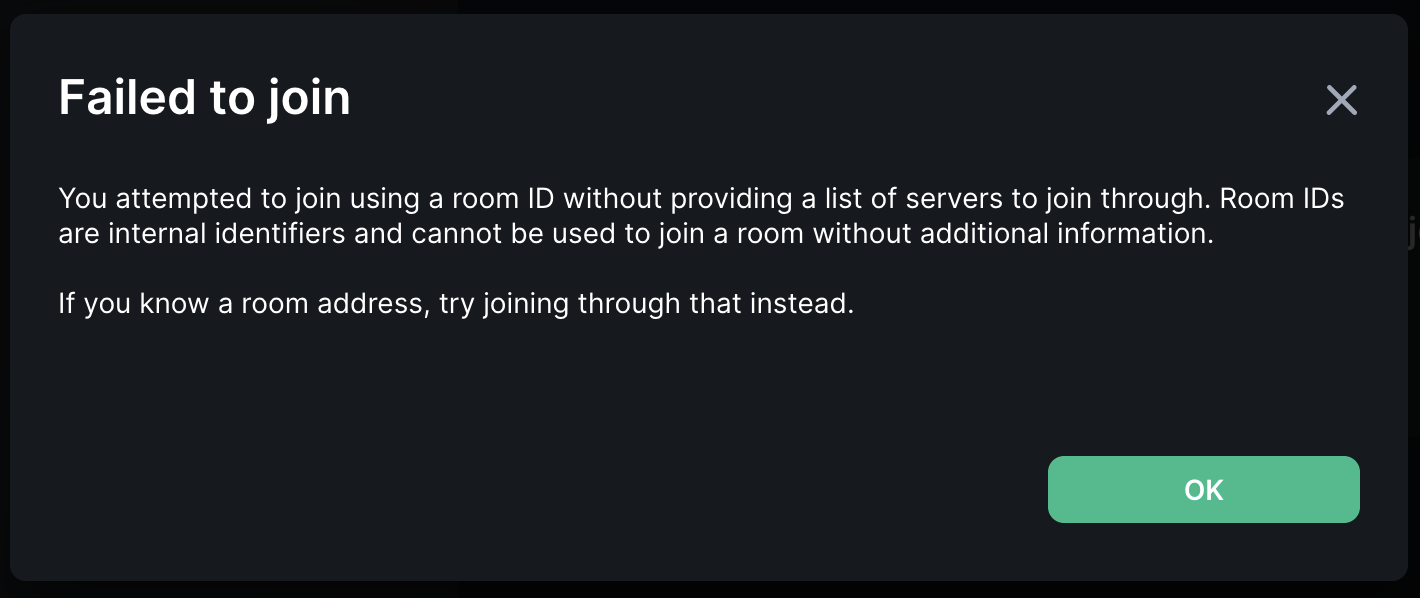 - You explain the concept of "via" servers and that none was given, however how to actually provide one is left open. Would it not make sense to hint at matrix.to with via servers?