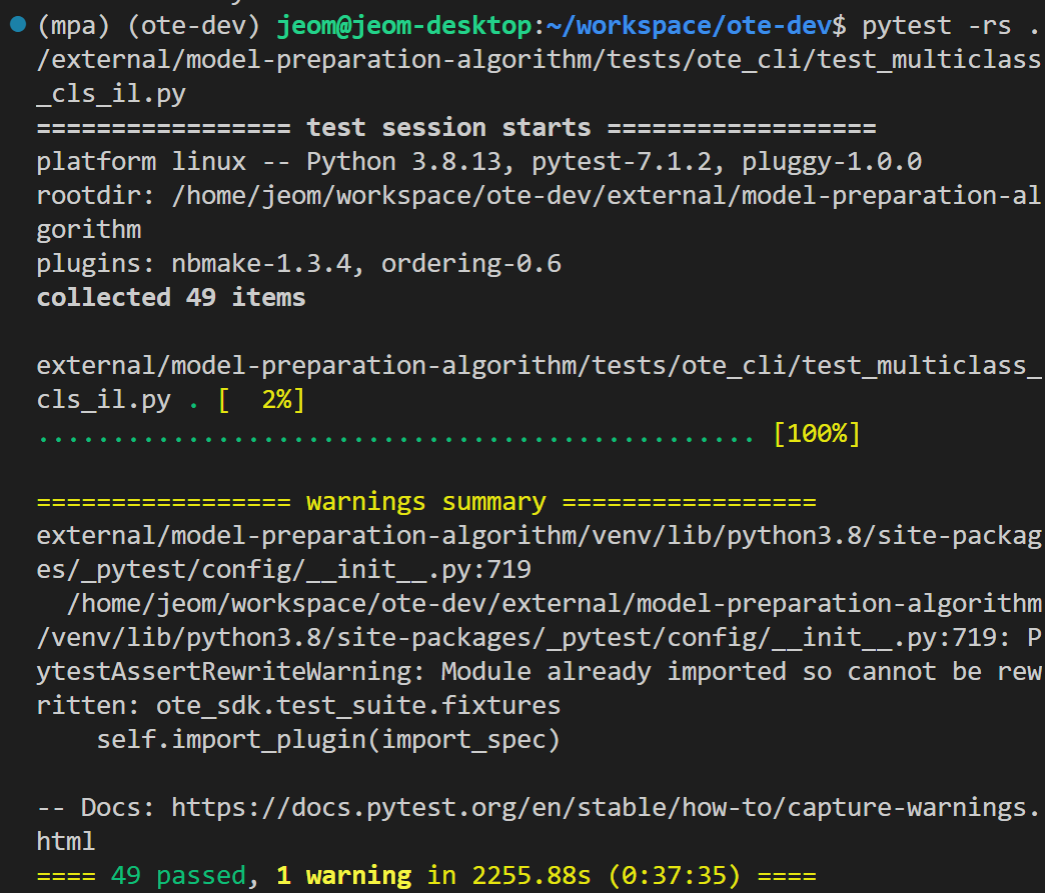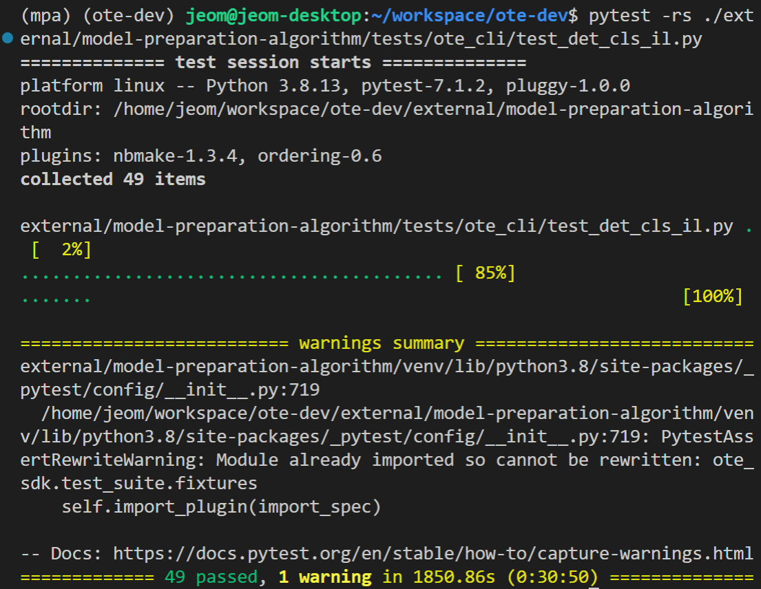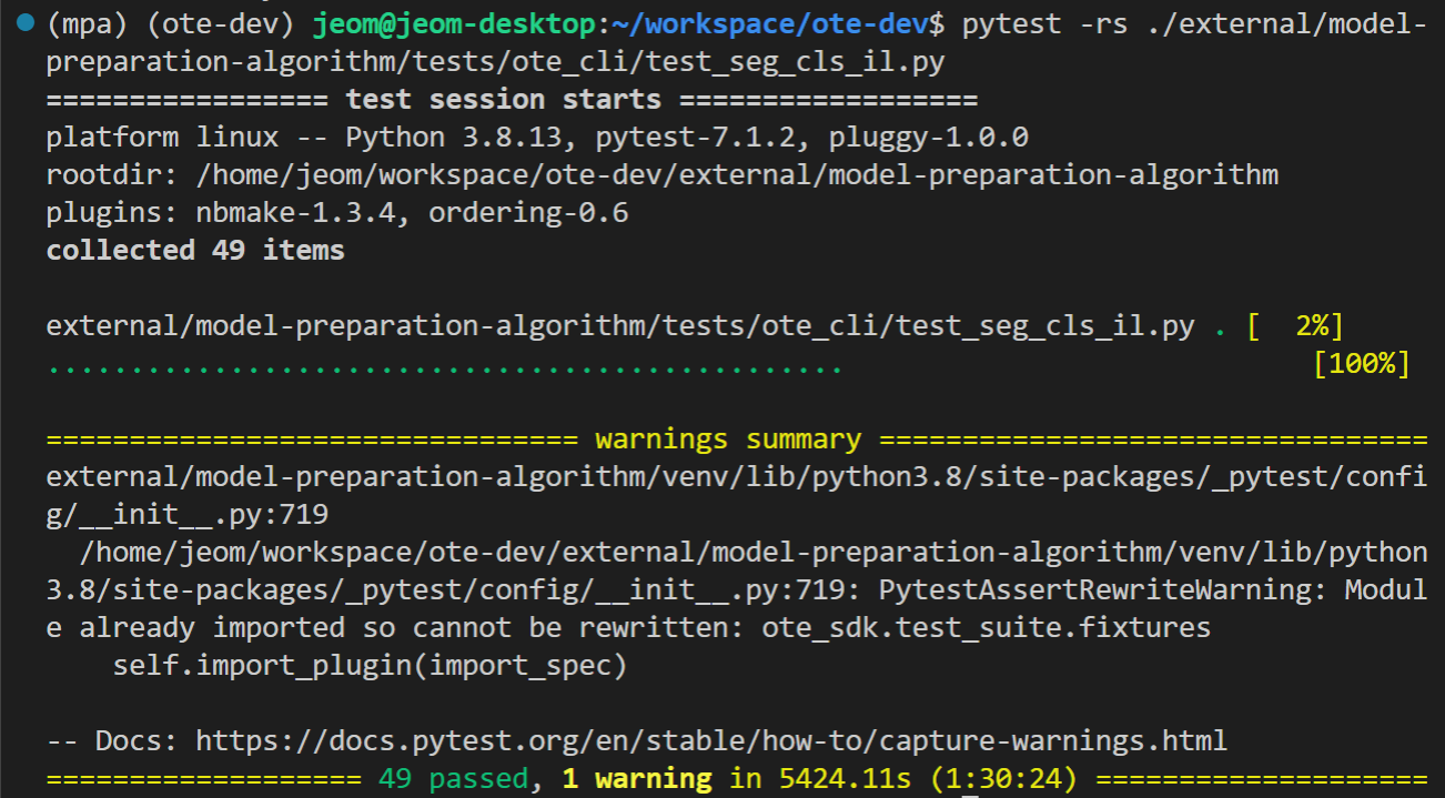 CI is not working properly, so I attach CLI test result from local environment. You can reproduce same result on this branch with this command: pytest -rs ./external/model-preparation-algorithm/tests/ote_cli/test_[multiclass, det, seg]_cls_il.py