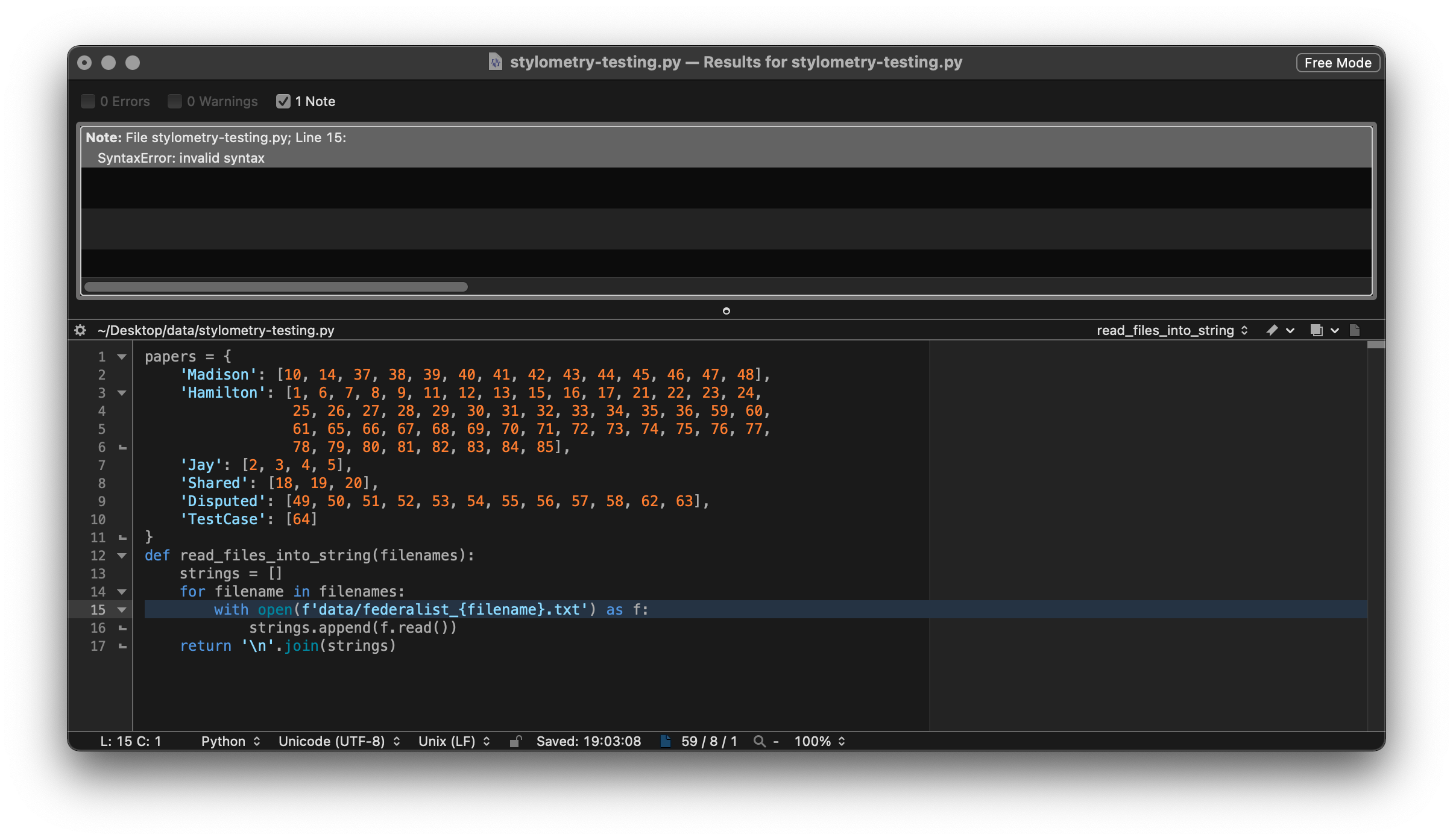 Using the Check Syntax feature in BBEdit, indeed it seems that there is a syntax error in the line with open(f'data/federalist_{filename}.txt') as f: