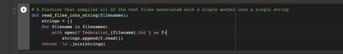 , 'r'to the linewith open(f'data/federalist_{filename}.txt') as f:so that it reads:with open(f'data/federalist_{filename}.txt', 'r') as f:(as suggested previously by Jairo)