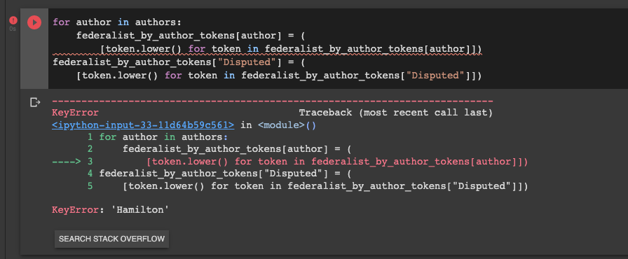 I've been able to move further forwards in Colab, although my first attempt to # Transform the authors' corpora into lists of word tokens generated LookupError: Resource punkt not found. Colab + StackOverflow both suggested the same method to obtain the resource, so I adapted this block as follows.