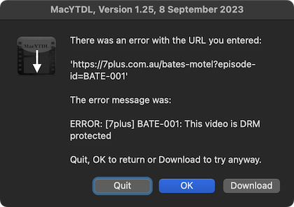 Shouldn't crash if a video is DRM'd. MacYTDL should show this dialog: