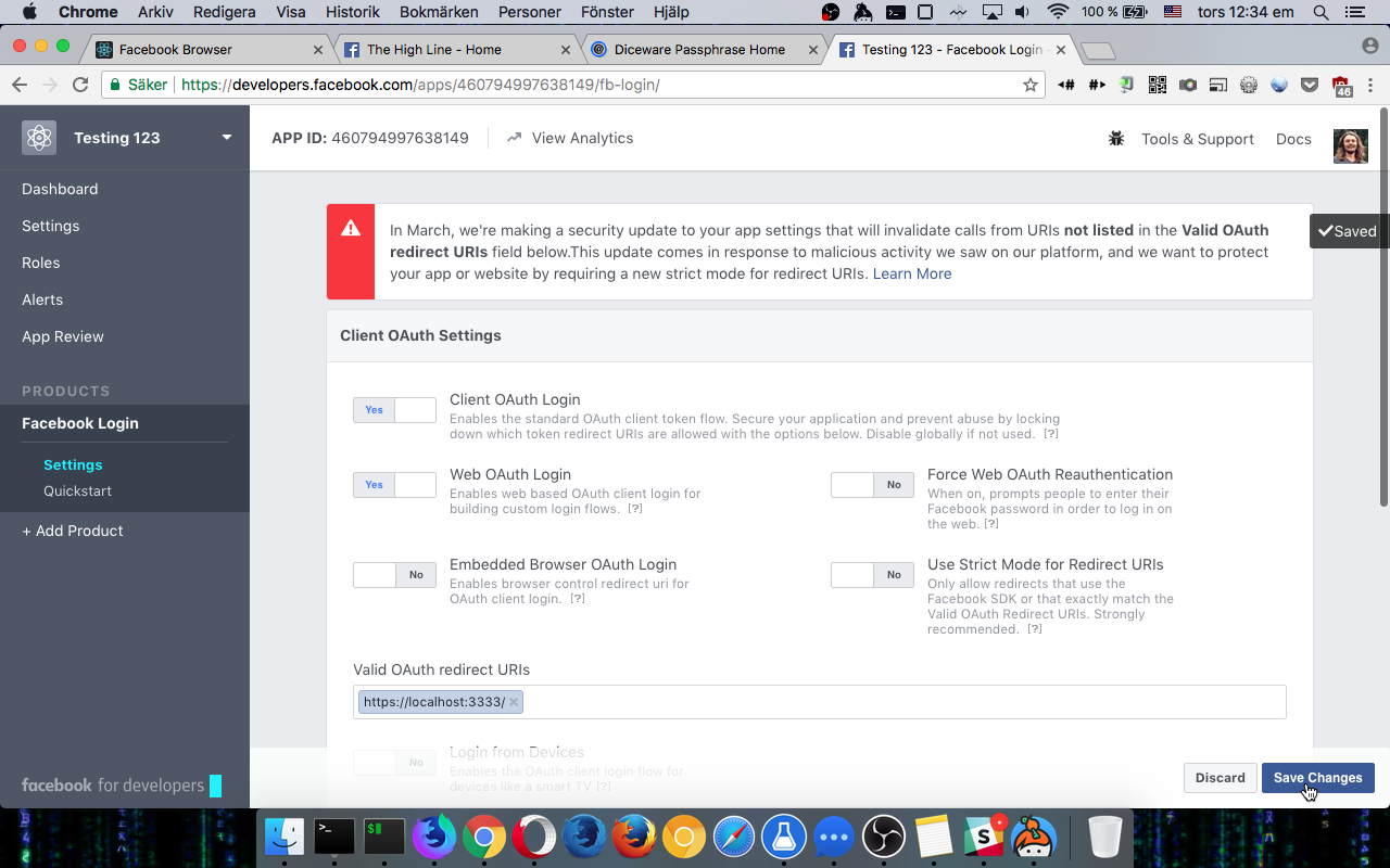 "In March, we're making a security update to your app settings that will invalidate calls from URIs not listed in the Valid OAuth redirect URIs field below.This update comes in response to malicious activity we saw on our platform, and we want to protect your app or website by requiring a new strict mode for redirect URIs. Learn More"