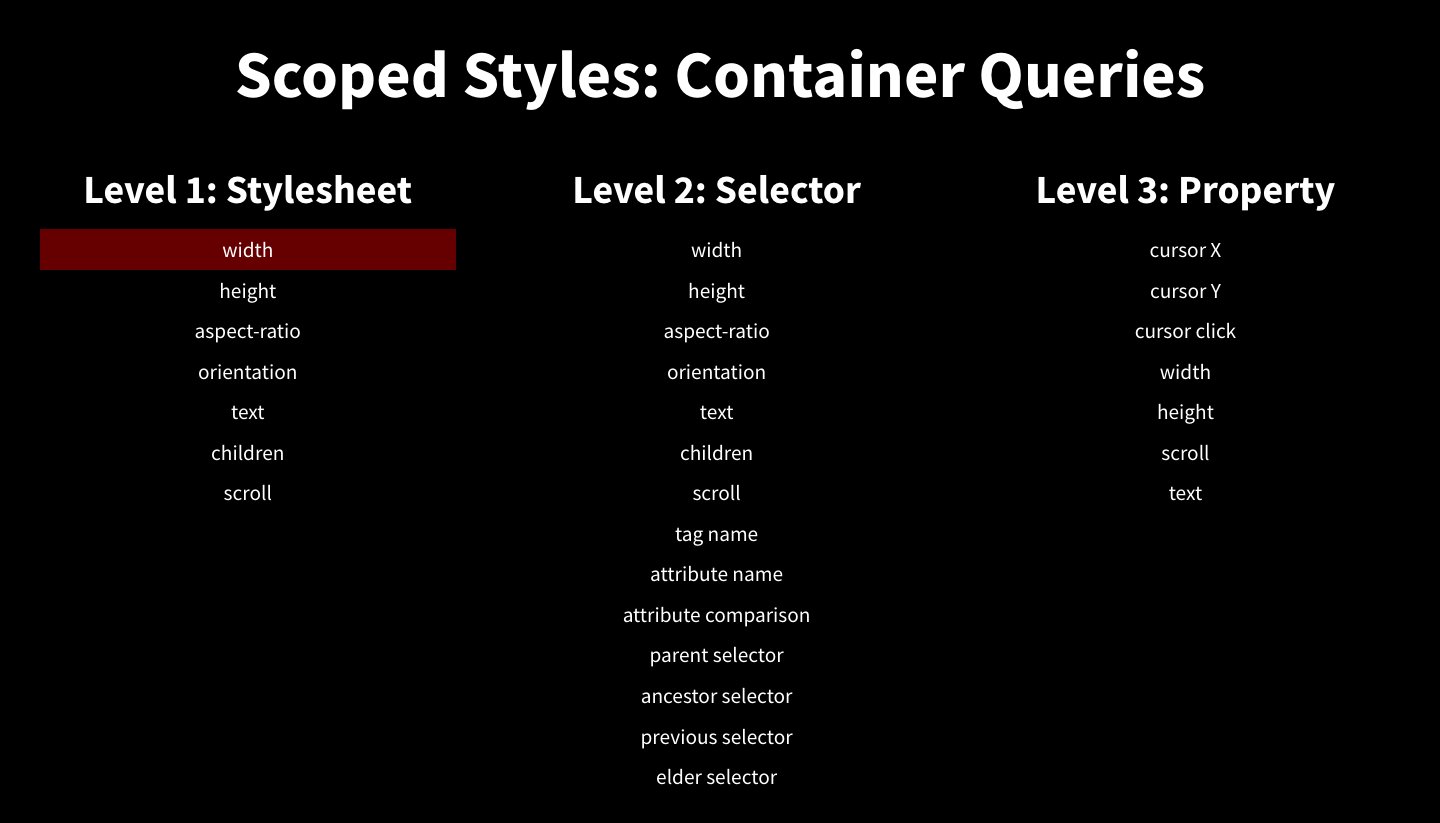 it's very useful to see your definition for "scoped" stylesheet and element / container queries.