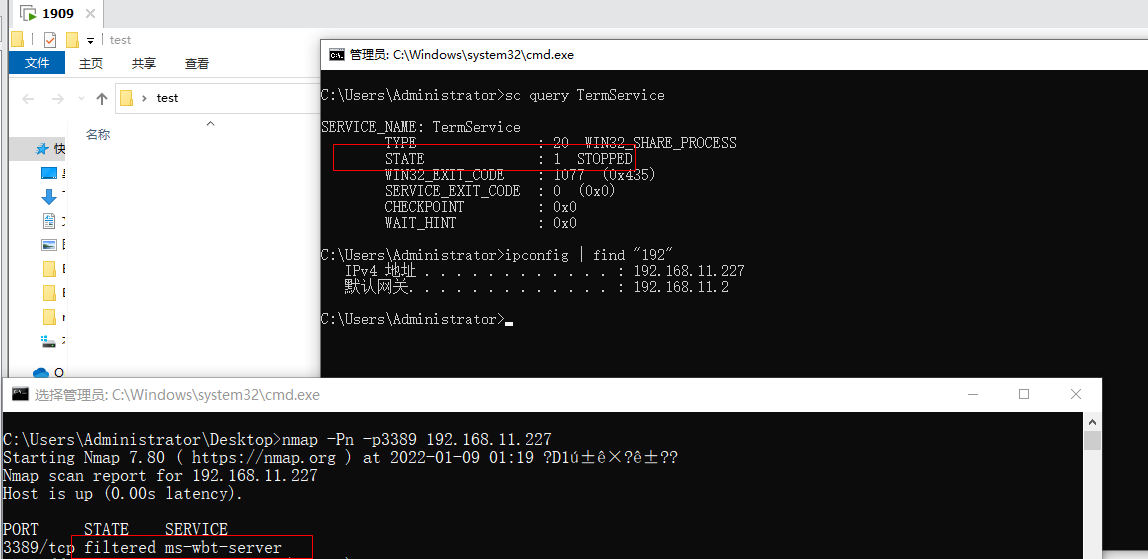 Use enablerdp.exe 3389 2 (start TermService and add rule-in in Firewall )