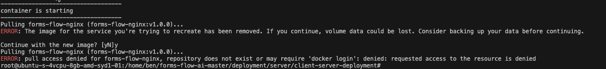 Continue with the new image? [yN]y Pulling forms-flow-nginx (forms-flow-nginx:v1.0.0)... ERROR: pull access denied for forms-flow-nginx, repository does not exist or may require 'docker login': denied: requested access to the resource is denied