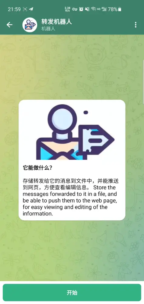 上面仅是最简安装步骤,完整说明参考 Telegram 转发机器人的部署流程。