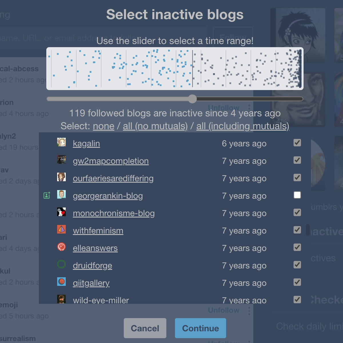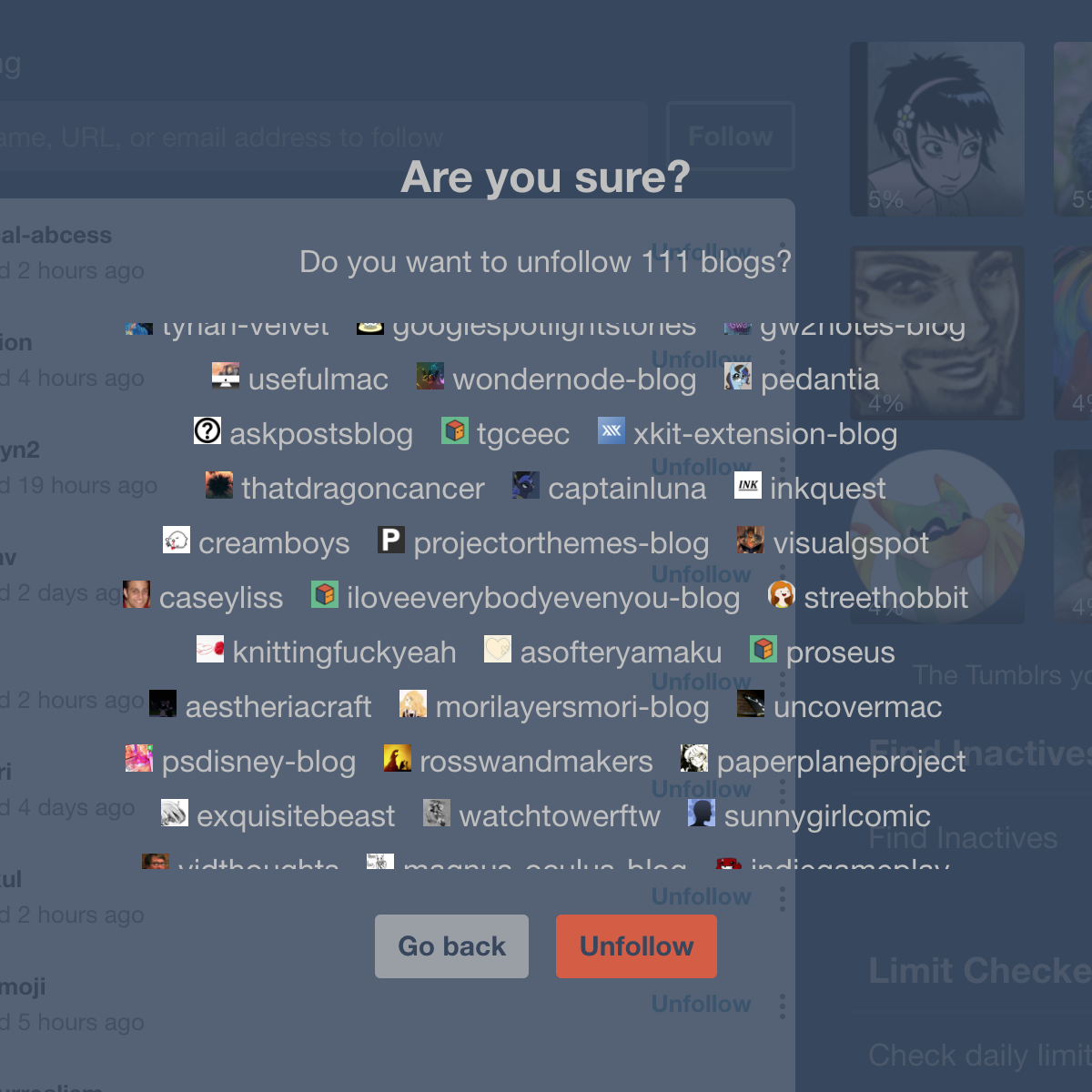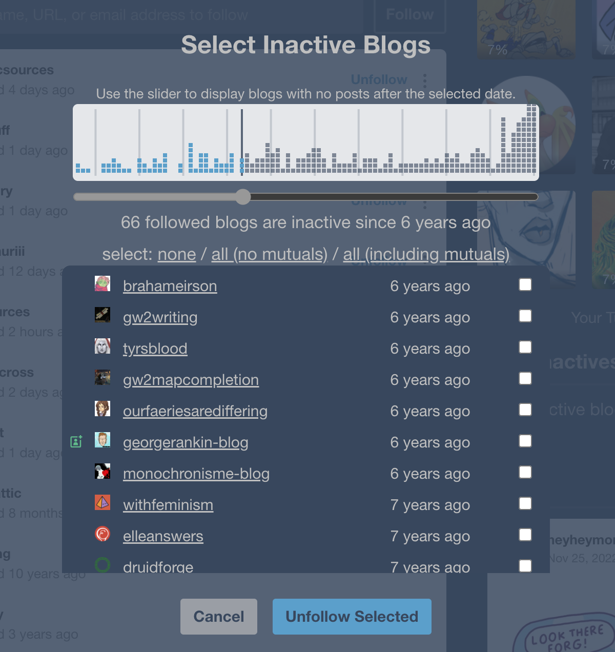 I'm committing the results of playing around with an interactive UI for a Find Inactives script, which provides a (kind of weird, kind of neat) visual for the distribution of last-updated times for all of your followed blogs along with the primary features of helping the user unfollow specific long-inactive blogs if they're near or at the following limit.