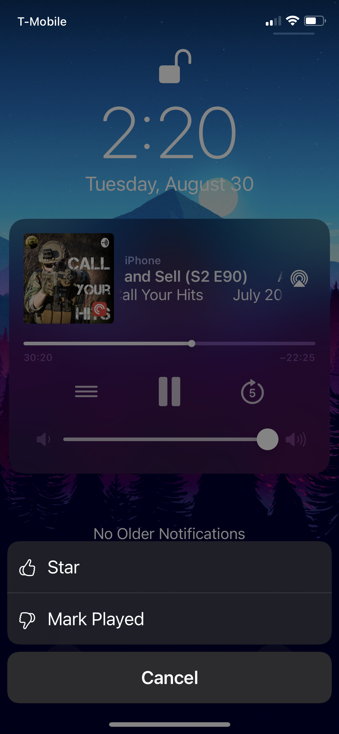 Clicking the star actually works and applies the star in Pocket Casts. It does not update the lock screen UI though (i.e. the star is not filled after clicking it), and you cannot un-star the episode. I'm guessing that we need to notify iOS that the star action was successful, which should then trigger the UI update. I'll look into this to see what we can do.