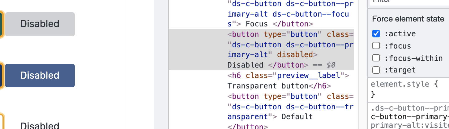 See the buttons in the CMSDS docs, and the MGov Default button. The :disabled state's background-color, color and behavior (e.g. pionter-events: none) all override declarations for other states, such as :hover, :active, and :focus