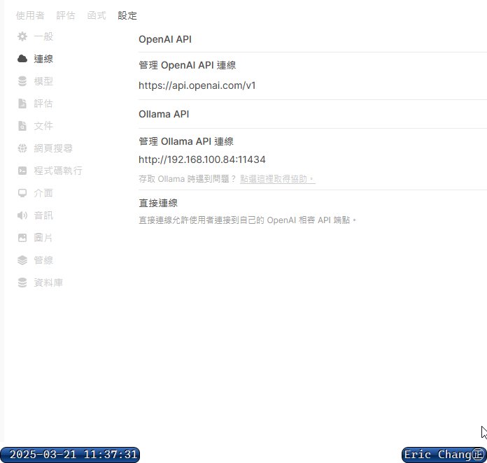 This is the interface of Open Web UI. I think it's clean and powerful, which makes it a pretty solid design. Users can choose which services to enable on their own. After enabling, they can manually input an API URL (or use the system default?) and an API Key. When saving, the system will verify if the entries are correct. In the future, the official team might even consider offering their own database analysis models for lease or commercial use.
