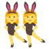 People with bunny ears ==== [](https://rawgit.com/emojitwo/emojitwo/master/svg/1f46f.svg) [](https://rawgit.com/emojitwo/emojitwo/master/svg/1f46f-2640.svg) [](https://rawgit.com/emojitwo/emojitwo/master/svg/1f46f-2642.svg) - Neutral base: U+1F46F Woman With Bunny Ears 👯 - Female U+2640: 👯‍♀️ - Male U+2642: 👯‍♂️ sub-issue of #60