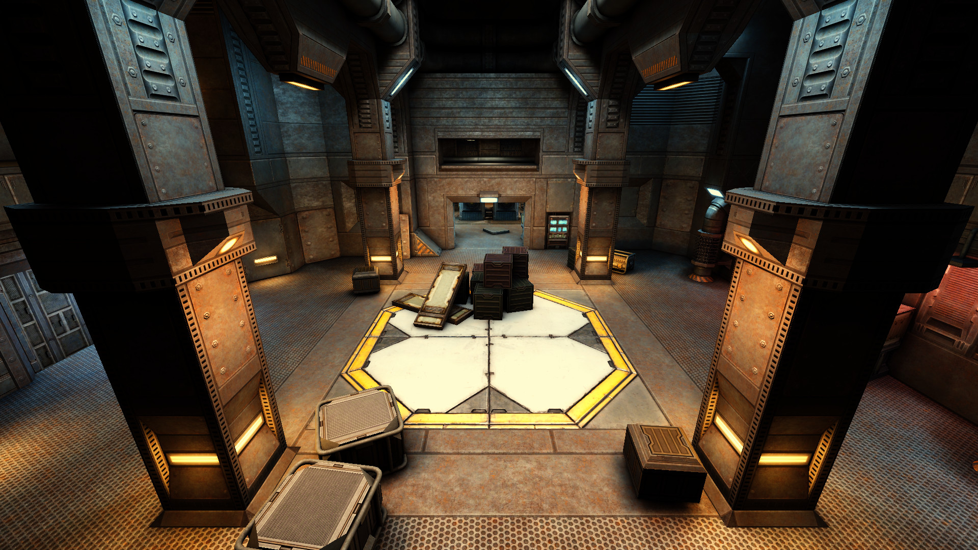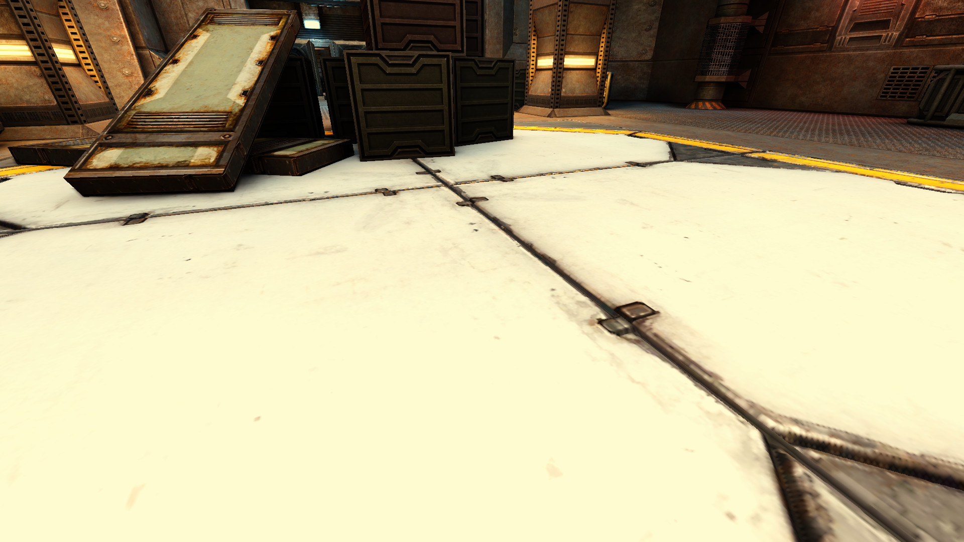 Then on some maps some contrast in the dark colors is too high and yet again feels very unrealistic and disturbing. I said dark colors, not dark lights, so for example the dark gray textures in spacetracks map triggers the annoyance a lot because their diffuse colors are dark. That contrast gives the feeling lighting is broken by turning gray textures into dark areas that looks like they are missing light while they are in rooms with enough light. Another map that suffers from it is station15.