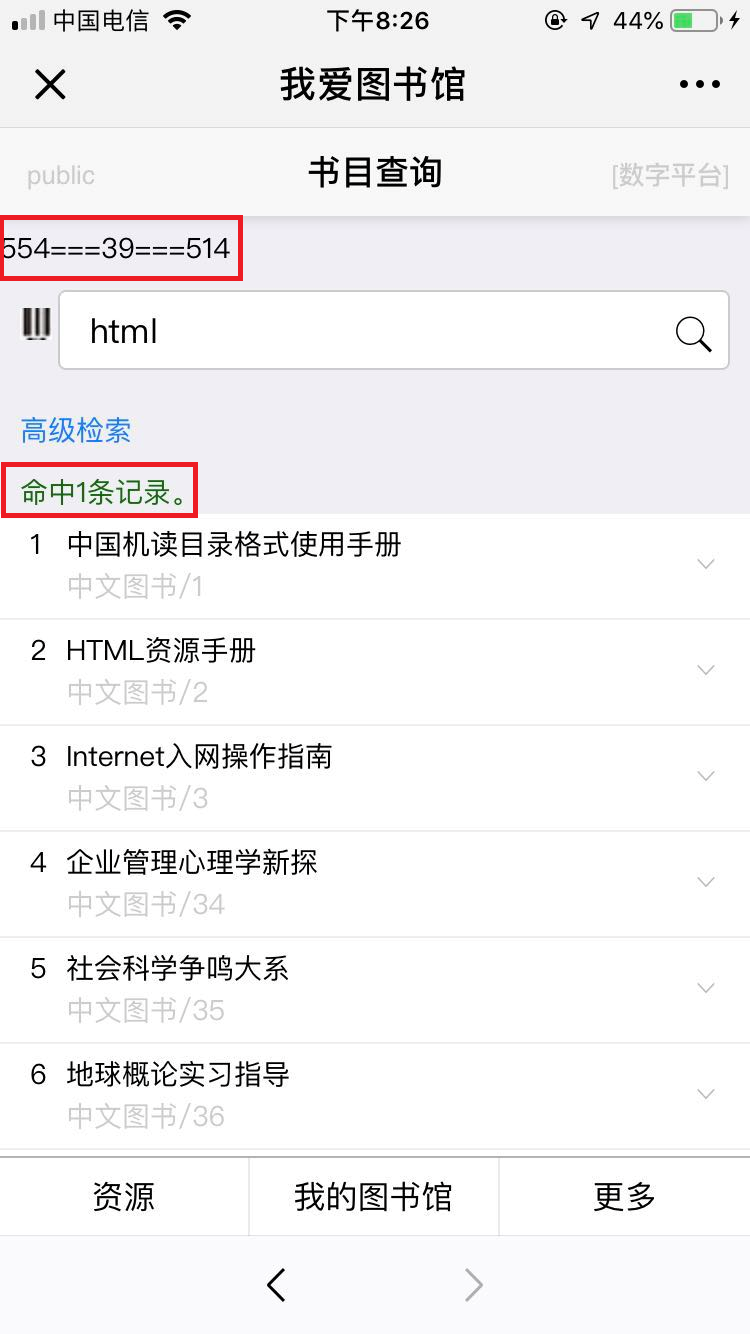 选定图书馆:数字平台,进行书目检索,检索词输入框空白,检索的过程中,输入检索词“html”,点检索图标,显示“命中1条记录”,实际显示“前15条记录+符合检索词html的那条记录”。