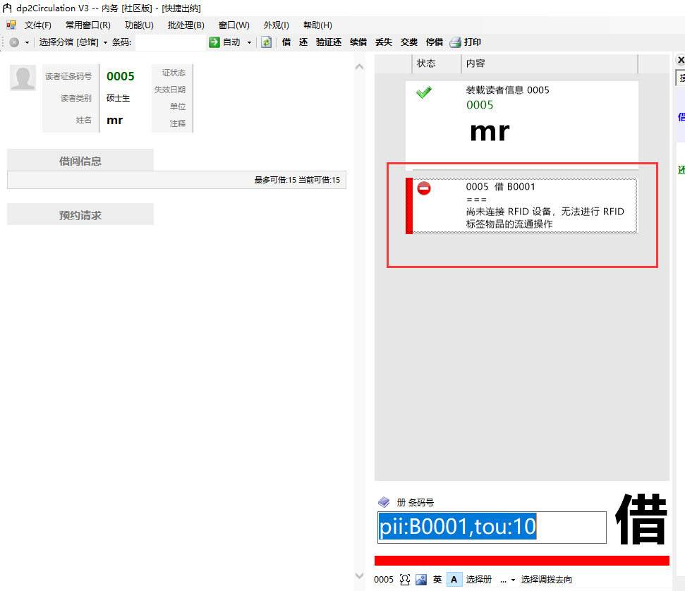 2)最新版本的测试版内务,打开快捷出纳窗时,没有语音提示“RFID发送打开”,借书时放标签到RFID读写器上,内务texbox没有任何反应。我打开dp2-RFID中心,手动打开发送后,再放标签上去,这时,内务借书任务列表报了一个错“尚未连接RFID设备,无法进行RFID标签物品的流通操作”。(问题没有重现)