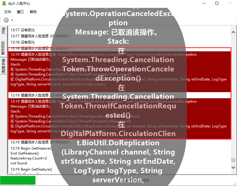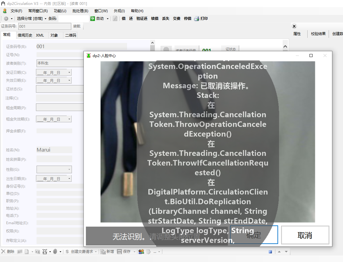 注:1)在内务登记人脸信息/刷人脸借书时,弹出 dp2-人脸中心 窗口后,有一个报错信息的显示,但是可以正常登记人脸和刷人脸。