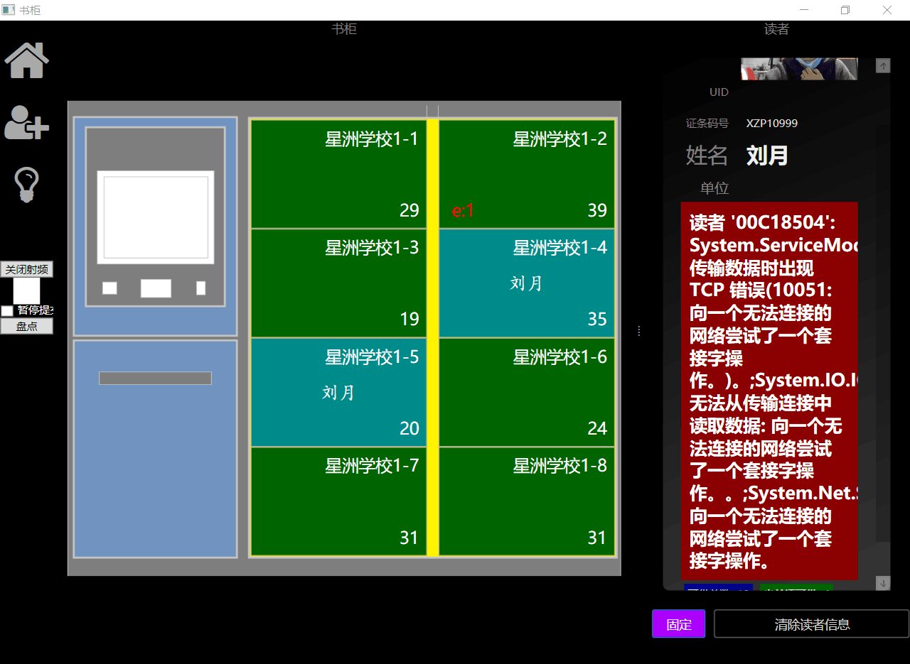 刷读者卡,语音提醒“欢迎您,xx”,随后【读者区】显示识别出的读者信息。