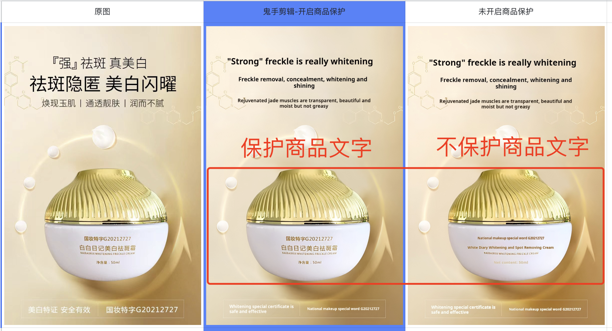 | 商品图可能会有商品本身的文字(商品文案或场景文字) | 商品文字也被误擦除 |