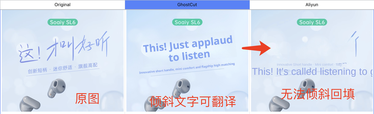 | 宣传文案会有底色,字体有颜色和描边 | 译后底色恢复不均匀,字体大小不统一,提取不准确 |