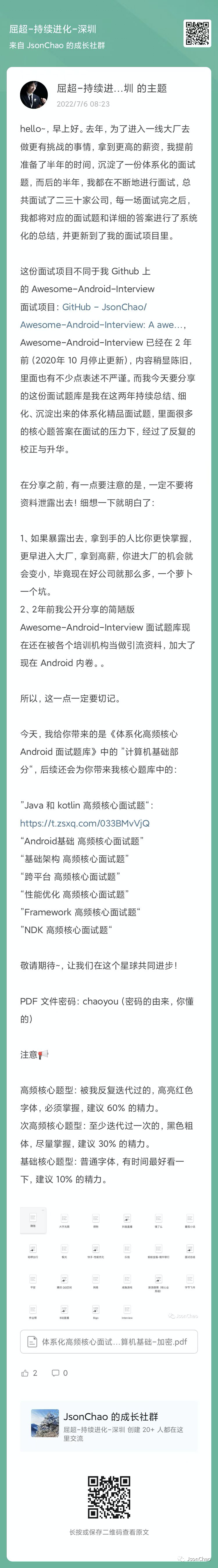 现在,我已经在我的成长社群里修订好了 《体系化高频核心 Android 面试题库》 中的 ”计算机基础高频核心面试题“ 和 ”Java 和 kotlin 高频核心面试题“ 部分,后续还会为你带来我核心题库中的: