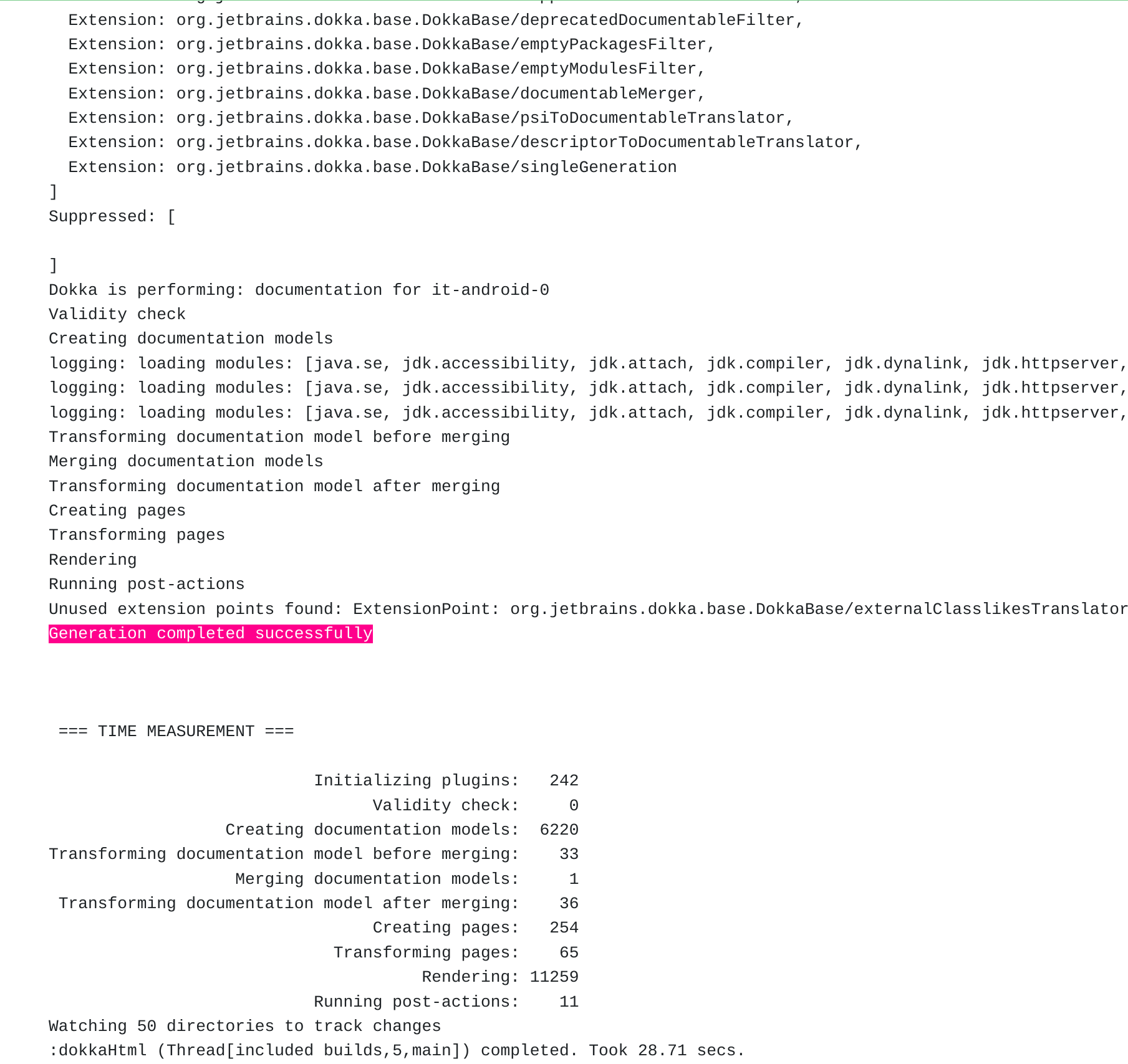 I would like to make a note here that these progress messages printed by Dokka are actually what Gradle outputs in the smart output only. Here are some examples:
