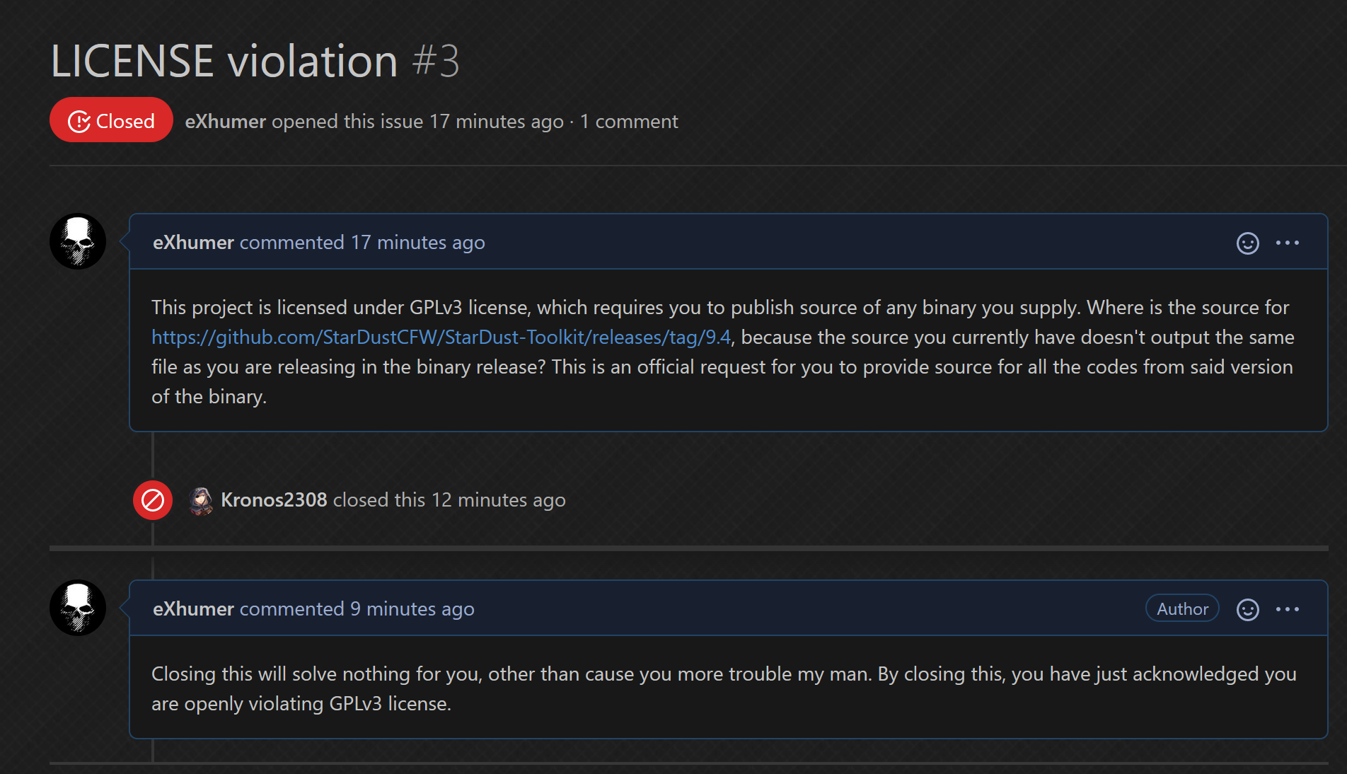 Creator is currently distributing a modified version of this application without providing source for the changes ~~, and is actively asking donations for it~~ (Creator has since stopped asking for donations it seems). I have made attempt to ask for source without any reply other than him directly closing the issue without any reply. He has since wiped his repository to remove all traces of your application from his source. This issue is being made just so that every contributor for this project are aware of it. If all contributors are OK with it, feel free to close this issue. Thanks.