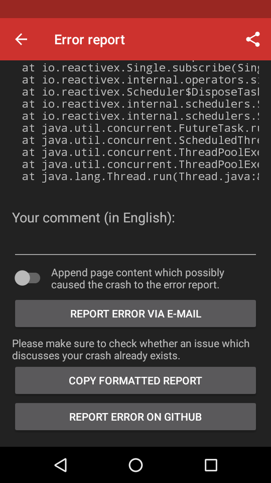 @Serkan-devel I added the Report error on GitHub button, which opens the share menu when FastHub or any other GitHub clients are installed. But as @theScrabi said, when directing people to create a new issue, they won't check whether one dealing with the problem already exists. As a result there would be tons of new issues which we need to close, but we'd like to spend our time with solving the bugs, not maintaining bug trackers :)