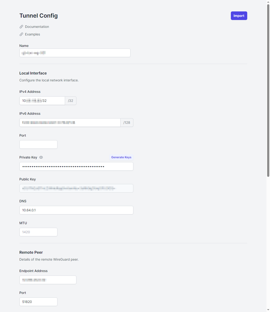 Tunnel Config Provide a screenshot of your tunnel config with tunnel name, private key, public key, pre-shared key and endpoint removed.