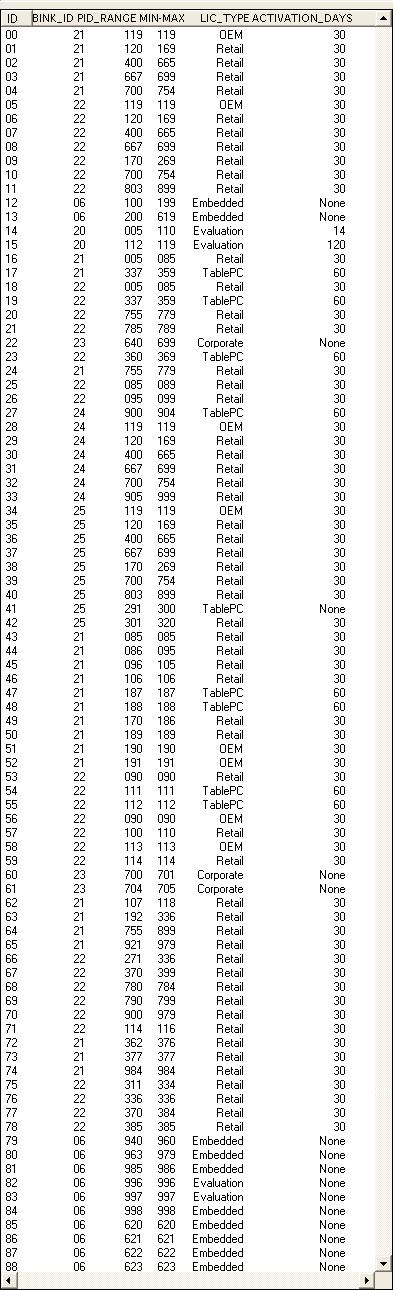 Here is some of the ID's I discovered. using the ultimate PID Checker and mskt.surge.io I am trying to make it easier for people to find these. Windows XP x86 idk any for x64: 005-085 RETAIL Working. 640-647 alternatively 640-699 VLK seems to be working. Halo PC/CE: 035-039 Working. Office 2007 Standard / Professional / Ultimate / Enterprise: 864 Working. Office 2007 Home & Student: 905 possibly working but I haven't tested. Office 2007 Basic / Small Business: Basic - 729 Possibly working but I haven't tested. Basic - 301 Possibly working but I haven't tested. Office 2003 Professional: 746 Possibly working but I haven't tested. VLK - 640 Possibly working but I haven't tested. Office 2003 Small Business: 761 Possibly working but I haven't tested.
