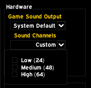 I'd also suggest adding a dropdown menu with the currently specified sound channels and an option to set it to 128. (custom) It's a big issue that causes sounds to cut off when many sounds are played simultaneously which happens real fast if people have combat sound enabled.