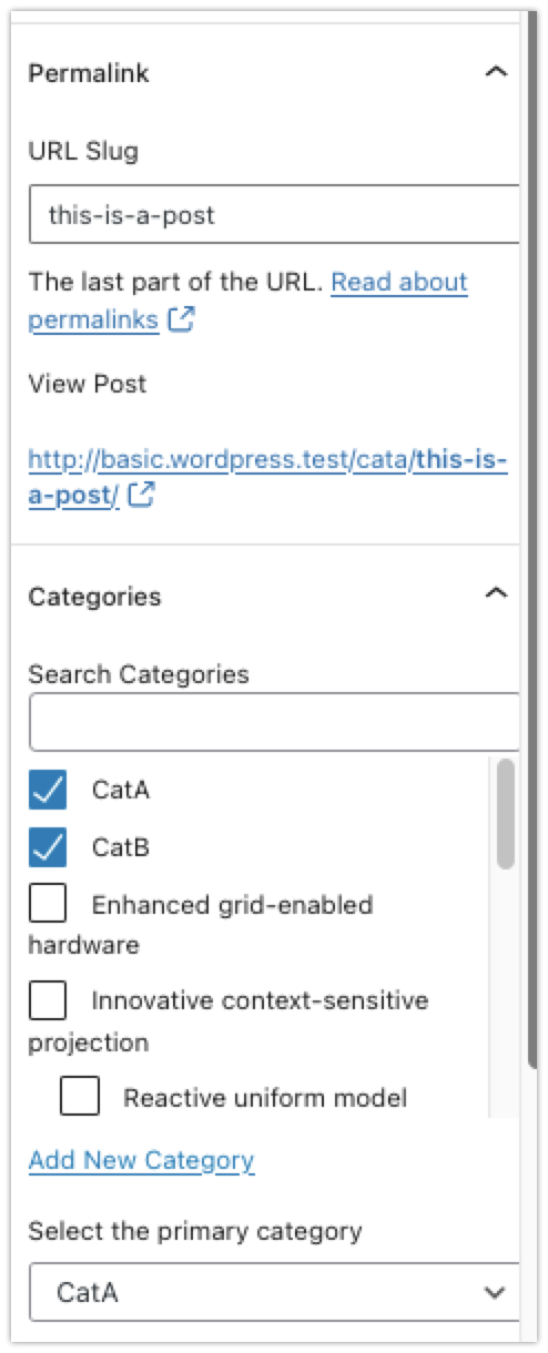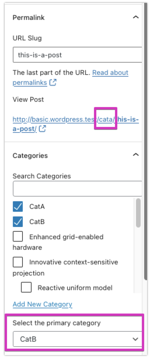packages/js/src/initializers/primary-category.jsadds and process the links for Gutenberg. There, we should probably add something to update the permalink after a new primary category has been selected. -