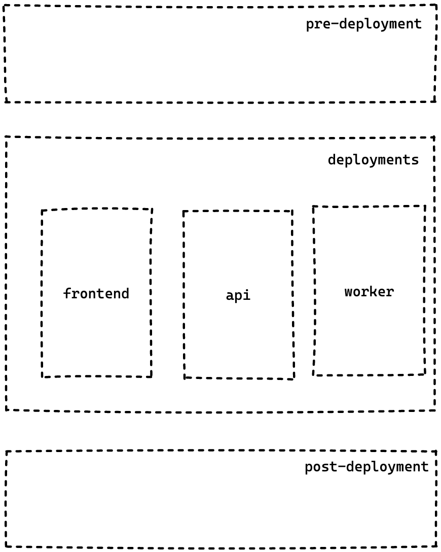 pre_deployment: send signal to tracking system "deployment #N starting", and then "run an instance of the new container image to run migration commands" (since the new image will contain the new code)deployments....post_deployment: send signal to tracking system: "deployment #N complete"